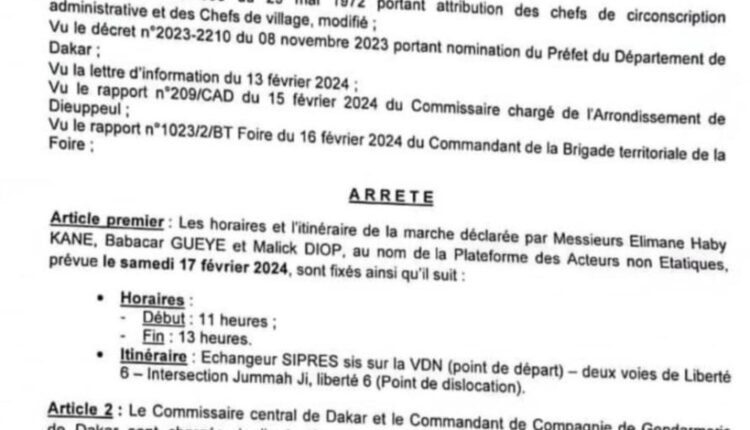 La marche silencieuse du collectif Aar Sunu élection est finalement autorisée par le préfet de Dakar. Interdite de marche ce vendredi, Aar Sunu élection maintient sa marche pour samedi. Elle prend départ au rond-point Sipress pour prendre fin à celui de Liberté 6.