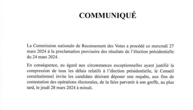 Après la publication des résultats provisoires de l’élection présidentielle du 24 mars 2024 ce mercredi, la Commission de recensement des votes informent aux candidats que les requêtes aux fins de contestation sont déposées au plus tard demain jeudi 28 mars á minuit.
