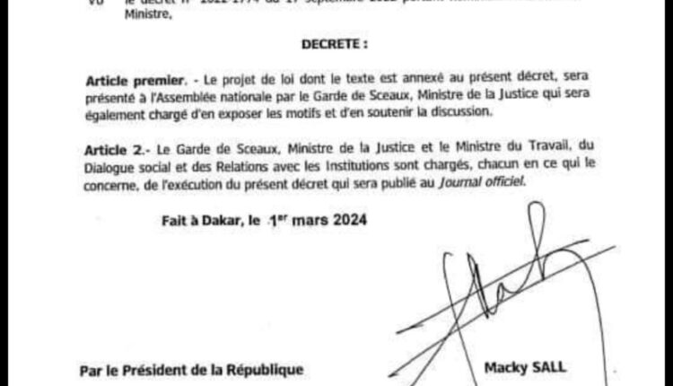 Dans un décret signé le 1er mars 2024, le Président Macky Sall a ordonné la présentation à l’Assemblée nationale le projet de loi portant amnistie. Le garde de Sceaux, ministre de la Justice est chargé d’en exposer les motifs et d’en soutenir la discussion.