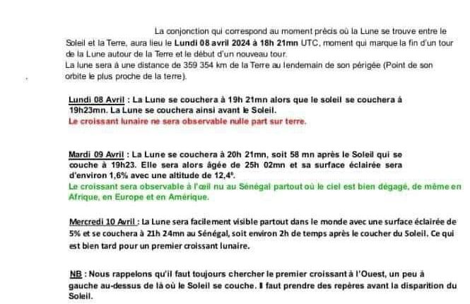 L’Association Sénégalaise pour la Promotion de l’Astronomie (ASPA) informe que la Croissant lunaire sera visible à l’œil nu au Sénégal mardi 09 Avril, partout où le ciel sera bien dégagé. Que le lundi 08 Avril, ce Croissant lunaire ne sera observable nulle part sur terre.