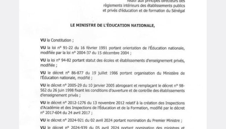 Le ministère de l’éducation a porté à la connaissance du public l’Arrêté relatif aux principes directeurs des règlements intérieurs des établissements publics et privés d’éducation et de formation du Sénégal. lesquels, d’après le document sont « soumis à l’approbation des Inspections d’Académie ». (Document).
